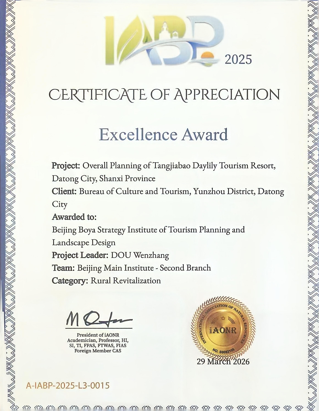 在本次大会上,北京博雅方略文旅集团创始人、首席专家窦文章教授受邀出席。由其指导,博雅方略旅游景观规划设计院完成的《山西省大同市唐家堡黄花旅游度假区》项目,荣获“LBP国际自然资源与规划范例Excellence Award”。这一荣誉不仅是对项目实践成果的高度认可,更是对博雅方略文旅集团在农文旅融合与乡村可持续发展领域深厚规划实力的权威肯定。